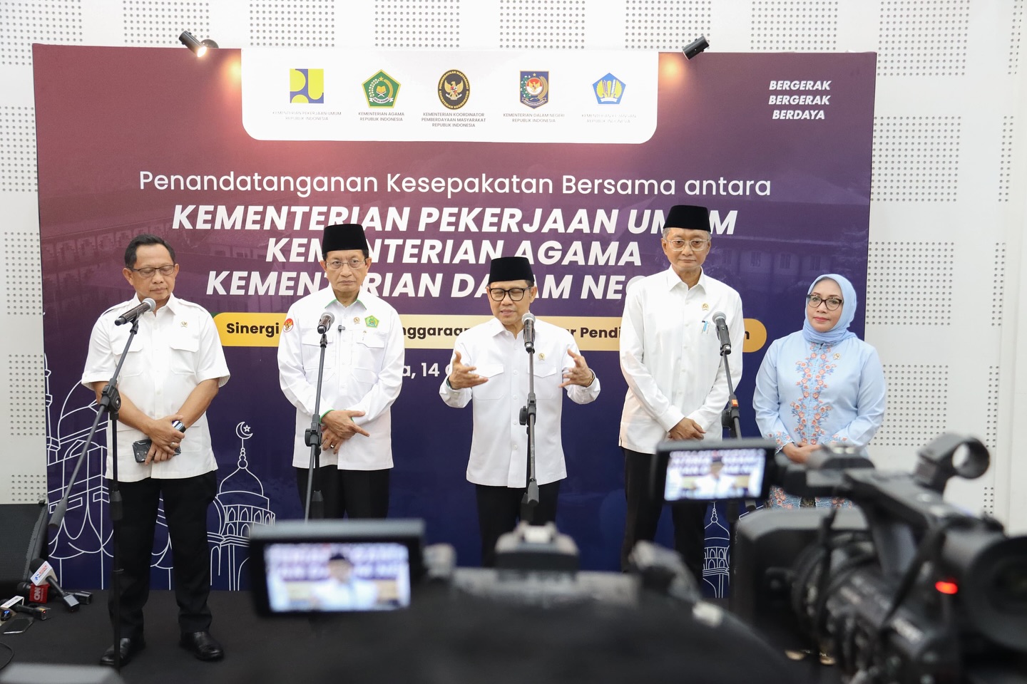 Jakarta | mantiknews.com — Pemerintah menegaskan komitmennya dalam memperkuat peran pesantren sebagai pusat pendidikan dan pemberdayaan umat melalui pembangunan infrastruktur yang aman, sehat, dan berkelanjutan. Komitmen tersebut diwujudkan melalui penandatanganan Kesepakatan Bersama (SKB) antara Kementerian Pekerjaan Umum (PU), Kementerian Agama (Kemenag), dan Kementerian Dalam Negeri (Kemendagri), yang berlangsung di Gedung Heritage Kemenko Bidang Pemberdayaan Masyarakat, Selasa (14/10/2025).