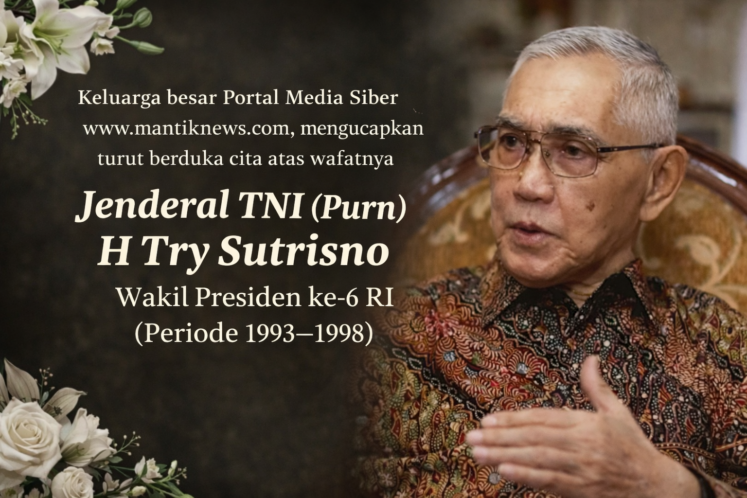 Jakarta | MantikNews.com – Wakil Presiden ke-6 Republik Indonesia, Jenderal TNI (Purn) Try Sutrisno, meninggal dunia pada usia 90 tahun. Almarhum wafat di RSPAD Gatot Subroto, Jakarta, Senin (2/3/2026) pukul 06.58 WIB.